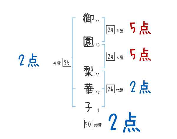 人運![]() | 御園梨華子さんの人運は24画の5つ星!家庭運が良く順調な人生。金運にも恵まれる。 性格や才能などを表す2番目に重要な運勢です。人間関係や協調性、社会的な成功に影響します。主に20歳から50歳ぐらいまでの中年期の運勢を表します。 |