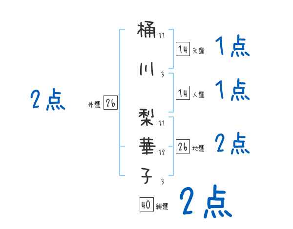 外運![]() | 桶川梨華子さんの外運は26画の2つ星!波瀾万丈かも。信頼できる人を大事にしましょう。 生活面を象徴する運勢です。外部から受ける影響力を表し、結婚運、家庭運や職場、環境への順応性を表します。 |
