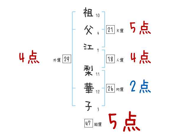 天運![]()  | 祖父江梨華子さんの天運は21画の5つ星!統率力がある。独立し成功する。名誉を手に入れる。 家系が持つ宿命的な運勢を表します。祖先から受け継いだ苗字ですので自分の力が及びません。家柄を象徴します。 |