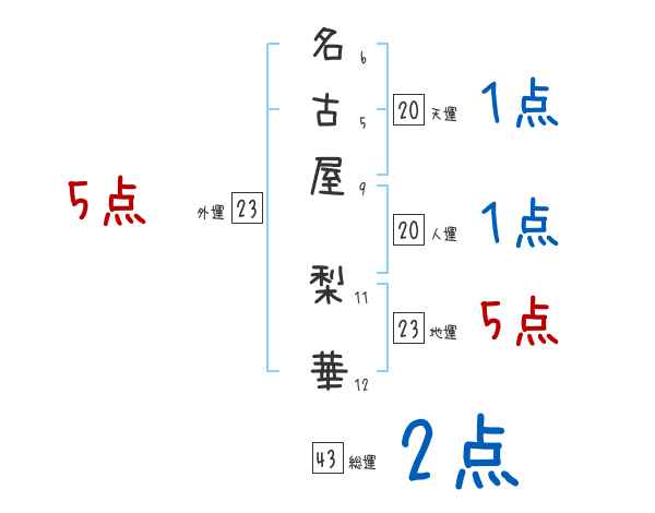 外運![]() | 名古屋梨華さんの外運は23画の5つ星!想像力に優れ活力がある。一代で成功し名誉を手に入れる。 生活面を象徴する運勢です。外部から受ける影響力を表し、結婚運、家庭運や職場、環境への順応性を表します。 |
