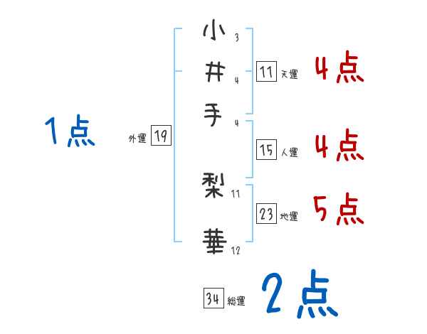 総運![]() | 小井手梨華さんの総運は34画の2つ星!独創性に優れるが、自尊心が強く災難に注意しましょう。 あなたの人生を表す1番重要な運勢です。生涯を通じて影響する総合運となり、主に50歳以降の晩年期に影響を及ぼします。 |