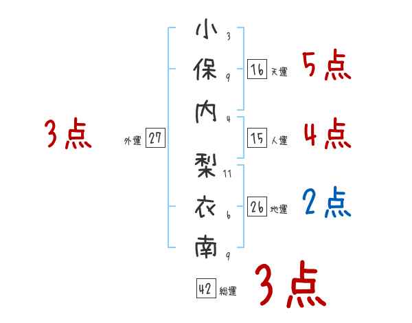 天運![]() | 小保内梨衣南さんの天運は16画の5つ星!人望が厚く大きく発展する。逆転成功が見える。 家系が持つ宿命的な運勢を表します。祖先から受け継いだ苗字ですので自分の力が及びません。家柄を象徴します。 |