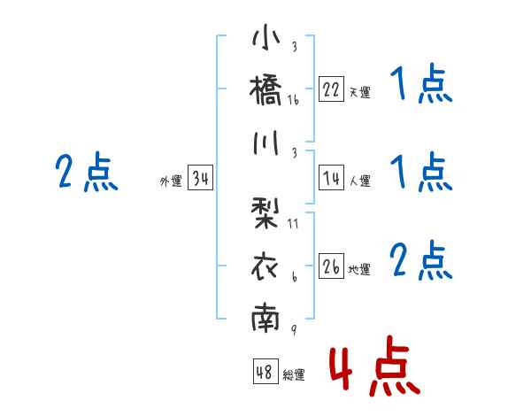 外運![]() | 小橋川梨衣南さんの外運は34画の2つ星!独創性に優れるが、自尊心が強く災難に注意しましょう。 生活面を象徴する運勢です。外部から受ける影響力を表し、結婚運、家庭運や職場、環境への順応性を表します。 |