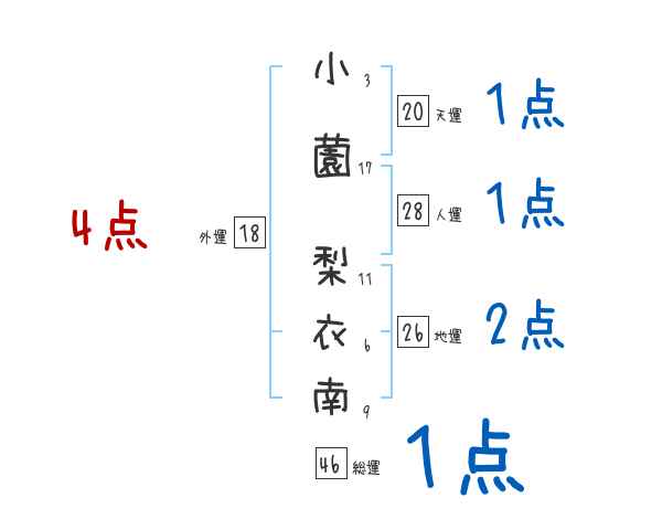 外運![]() | 小薗梨衣南さんの外運は18画の4つ星!情熱的で剛気。忍耐力があり信頼される。 生活面を象徴する運勢です。外部から受ける影響力を表し、結婚運、家庭運や職場、環境への順応性を表します。 |