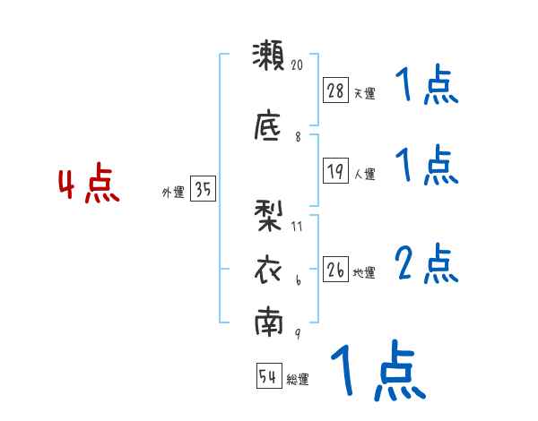 外運![]() | 瀬底梨衣南さんの外運は35画の4つ星!温厚な性格で感受性が高い。穏和な性格で人望が厚い。 生活面を象徴する運勢です。外部から受ける影響力を表し、結婚運、家庭運や職場、環境への順応性を表します。 |