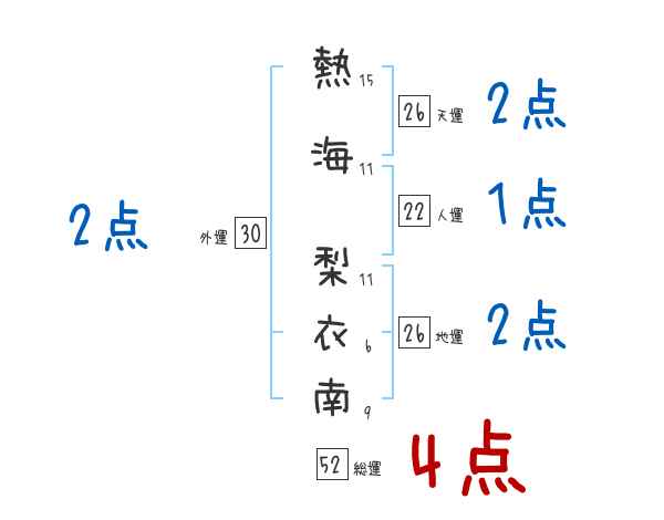 外運![]() | 熱海梨衣南さんの外運は30画の2つ星!浮き沈みの激しさに注意しましょう。 生活面を象徴する運勢です。外部から受ける影響力を表し、結婚運、家庭運や職場、環境への順応性を表します。 |