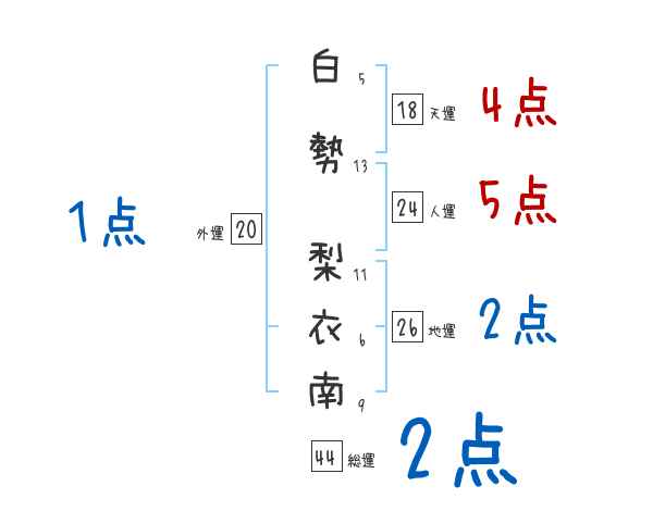 総運![]() | 白勢梨衣南さんの総運は44画の2つ星!誠実で慎重な性格。物事を考えすぎないように注意しましょう。 あなたの人生を表す1番重要な運勢です。生涯を通じて影響する総合運となり、主に50歳以降の晩年期に影響を及ぼします。 |