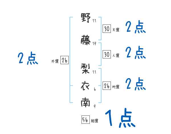 天運![]() | 野藤梨衣南さんの天運は30画の2つ星!浮き沈みの激しさに注意しましょう。 家系が持つ宿命的な運勢を表します。祖先から受け継いだ苗字ですので自分の力が及びません。家柄を象徴します。 |