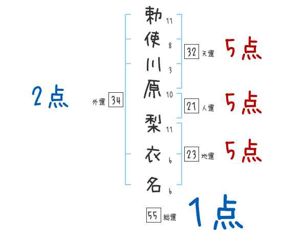 天運![]() | 勅使川原梨衣名さんの天運は32画の5つ星!柔軟性があり成功する。チャンスが多く金運が良い。 家系が持つ宿命的な運勢を表します。祖先から受け継いだ苗字ですので自分の力が及びません。家柄を象徴します。 |