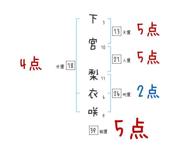 総運![]() | 下宮梨衣咲さんの総運は39画の5つ星!社交性に優れ人望が厚い。人の上に立ち成功する。 あなたの人生を表す1番重要な運勢です。生涯を通じて影響する総合運となり、主に50歳以降の晩年期に影響を及ぼします。 |