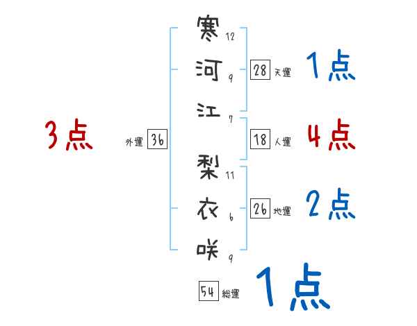外運![]() | 寒河江梨衣咲さんの外運は36画の3つ星!先見性が豊かです。多少神経質で苦労することも。 生活面を象徴する運勢です。外部から受ける影響力を表し、結婚運、家庭運や職場、環境への順応性を表します。 |