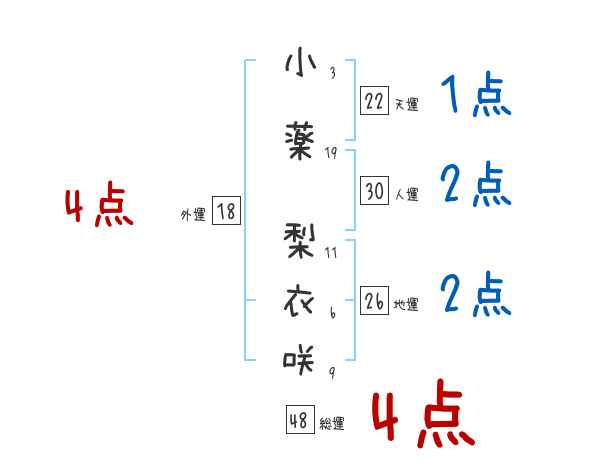 天運![]() | 小薬梨衣咲さんの天運は22画の1つ星!努力することが苦手ないっぽう手先が器用。芸術性にも優れる。 家系が持つ宿命的な運勢を表します。祖先から受け継いだ苗字ですので自分の力が及びません。家柄を象徴します。 |