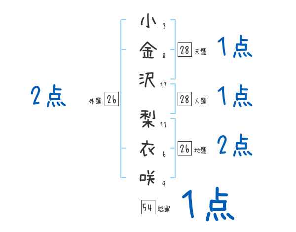 外運![]() | 小金沢梨衣咲さんの外運は26画の2つ星!波瀾万丈かも。信頼できる人を大事にしましょう。 生活面を象徴する運勢です。外部から受ける影響力を表し、結婚運、家庭運や職場、環境への順応性を表します。 |