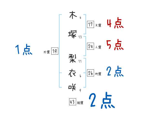 外運![]() | 木塚梨衣咲さんの外運は19画の1つ星!優れた才能を持ちますが、協調性が足りないことも。周りの人と協力する事を意識しましょう。 生活面を象徴する運勢です。外部から受ける影響力を表し、結婚運、家庭運や職場、環境への順応性を表します。 |