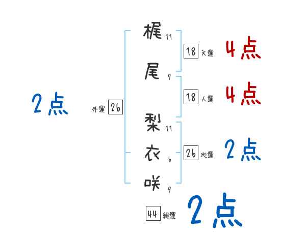 地運![]() | 梶尾梨衣咲さんの地運は26画の2つ星!波瀾万丈かも。信頼できる人を大事にしましょう。 個性を表す基礎的な運勢です。性格形成や対人関係、行動力など家庭環境に影響されます。主に誕生してから20歳くらいまでの若年期の運勢を表します。 |