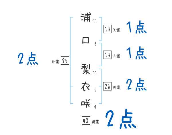 外運![]() | 浦口梨衣咲さんの外運は26画の2つ星!波瀾万丈かも。信頼できる人を大事にしましょう。 生活面を象徴する運勢です。外部から受ける影響力を表し、結婚運、家庭運や職場、環境への順応性を表します。 |