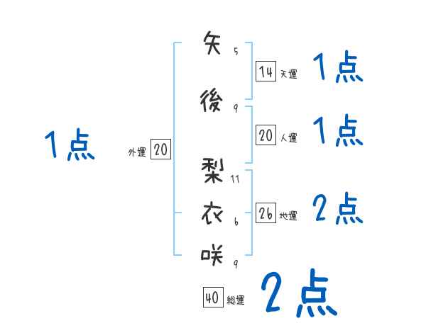 地運![]() | 矢後梨衣咲さんの地運は26画の2つ星!波瀾万丈かも。信頼できる人を大事にしましょう。 個性を表す基礎的な運勢です。性格形成や対人関係、行動力など家庭環境に影響されます。主に誕生してから20歳くらいまでの若年期の運勢を表します。 |