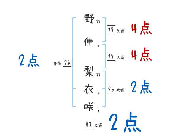 外運![]() | 野仲梨衣咲さんの外運は26画の2つ星!波瀾万丈かも。信頼できる人を大事にしましょう。 生活面を象徴する運勢です。外部から受ける影響力を表し、結婚運、家庭運や職場、環境への順応性を表します。 |