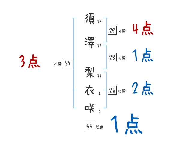 天運![]() | 須澤梨衣咲さんの天運は29画の4つ星!完全主義で才能がある。厳格な心の持ち主。 家系が持つ宿命的な運勢を表します。祖先から受け継いだ苗字ですので自分の力が及びません。家柄を象徴します。 |