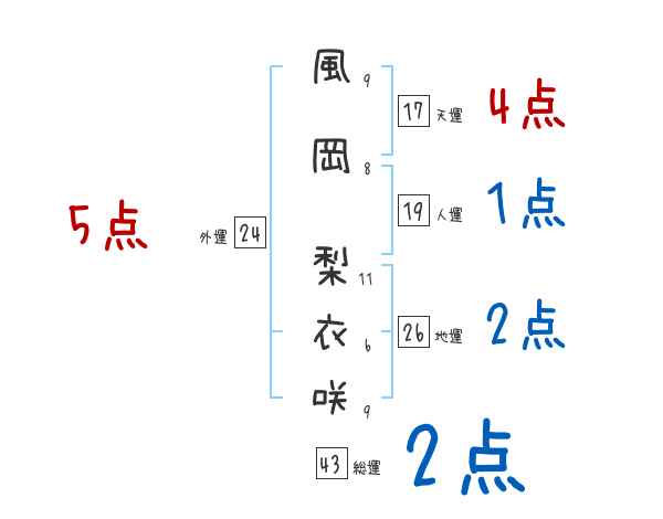 外運![]() | 風岡梨衣咲さんの外運は24画の5つ星!家庭運が良く順調な人生。金運にも恵まれる。 生活面を象徴する運勢です。外部から受ける影響力を表し、結婚運、家庭運や職場、環境への順応性を表します。 |