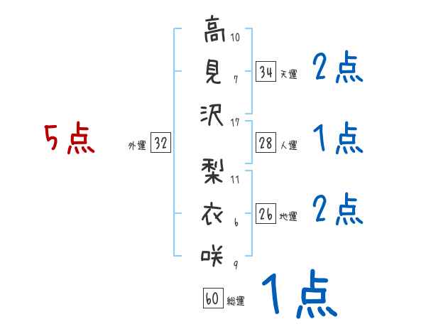 外運![]() | 高見沢梨衣咲さんの外運は32画の5つ星!柔軟性があり成功する。チャンスが多く金運が良い。 生活面を象徴する運勢です。外部から受ける影響力を表し、結婚運、家庭運や職場、環境への順応性を表します。 |
