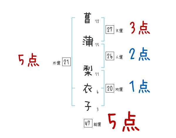外運![]() | 菖蒲梨衣子さんの外運は21画の5つ星!統率力がある。独立し成功する。名誉を手に入れる。 生活面を象徴する運勢です。外部から受ける影響力を表し、結婚運、家庭運や職場、環境への順応性を表します。 |