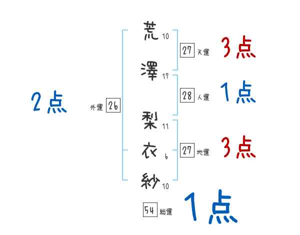 外運![]() | 荒澤梨衣紗さんの外運は26画の2つ星!波瀾万丈かも。信頼できる人を大事にしましょう。 生活面を象徴する運勢です。外部から受ける影響力を表し、結婚運、家庭運や職場、環境への順応性を表します。 |