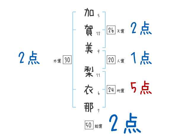 | 総運  | 加賀美梨衣那さんの総運は50画の2つ星!浮き沈みが激しく不安定。しりすぼみに衰退しやすいので注意しましょう。あなたの人生を表す1番重要な運勢です。生涯を通じて影響する総合運となり、主に50歳以降の晩年期に影響を及ぼします。 |
