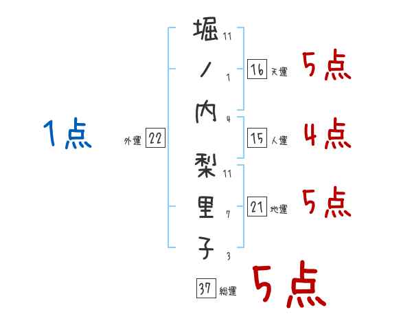 外運![]() | 堀ノ内梨里子さんの外運は22画の1つ星!努力することが苦手ないっぽう手先が器用。芸術性にも優れる。 生活面を象徴する運勢です。外部から受ける影響力を表し、結婚運、家庭運や職場、環境への順応性を表します。 |