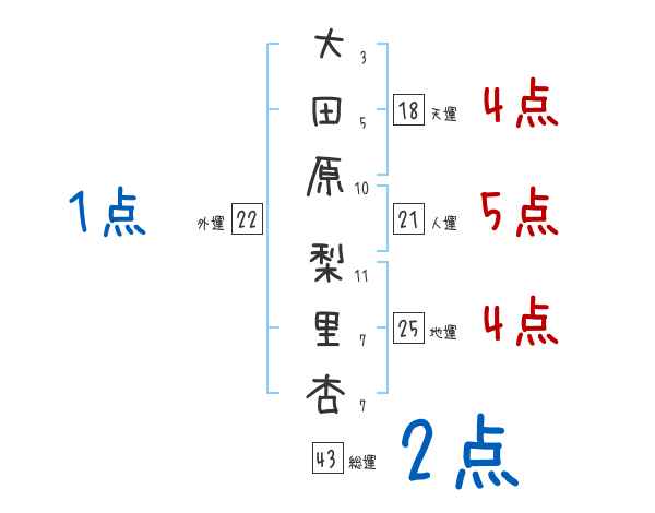 天運![]() | 大田原梨里杏さんの天運は18画の4つ星!情熱的で剛気。忍耐力があり信頼される。 家系が持つ宿命的な運勢を表します。祖先から受け継いだ苗字ですので自分の力が及びません。家柄を象徴します。 |