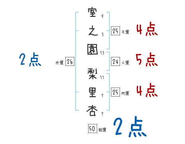 外運![]() | 室之園梨里杏さんの外運は26画の2つ星!波瀾万丈かも。信頼できる人を大事にしましょう。 生活面を象徴する運勢です。外部から受ける影響力を表し、結婚運、家庭運や職場、環境への順応性を表します。 |