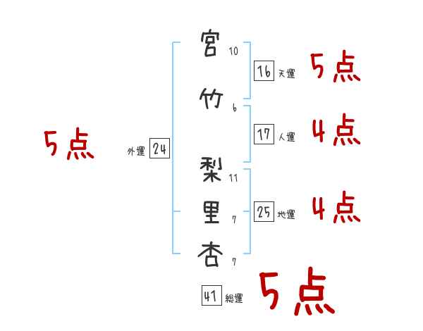 外運![]() | 宮竹梨里杏さんの外運は24画の5つ星!家庭運が良く順調な人生。金運にも恵まれる。 生活面を象徴する運勢です。外部から受ける影響力を表し、結婚運、家庭運や職場、環境への順応性を表します。 |