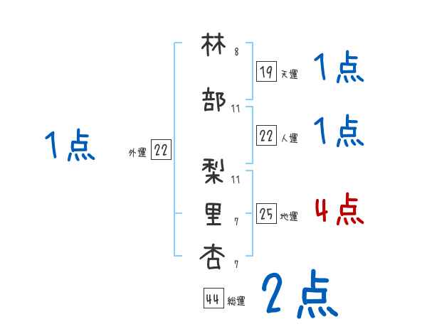 総運![]() | 林部梨里杏さんの総運は44画の2つ星!誠実で慎重な性格。物事を考えすぎないように注意しましょう。 あなたの人生を表す1番重要な運勢です。生涯を通じて影響する総合運となり、主に50歳以降の晩年期に影響を及ぼします。 |