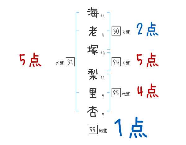 総運![]() | 海老塚梨里杏さんの総運は55画の1つ星!欲張りな性格で軽率な行動に注意しましょう。病気に気をつけて。 あなたの人生を表す1番重要な運勢です。生涯を通じて影響する総合運となり、主に50歳以降の晩年期に影響を及ぼします。 |