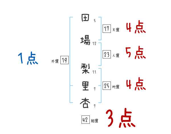 天運![]() | 田場梨里杏さんの天運は17画の4つ星!積極的な行動力。地位を気づき財産を手に入れる。純粋な心と直感力。 家系が持つ宿命的な運勢を表します。祖先から受け継いだ苗字ですので自分の力が及びません。家柄を象徴します。 |