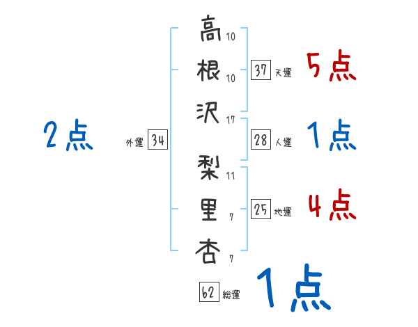 総運![]() | 高根沢梨里杏さんの総運は62画の1つ星!困難なトラブルが多く精神的に疲労しないように気をつけましょう。 あなたの人生を表す1番重要な運勢です。生涯を通じて影響する総合運となり、主に50歳以降の晩年期に影響を及ぼします。 |