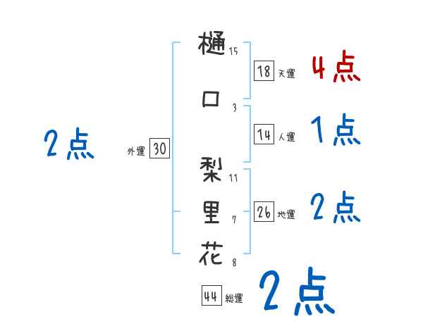 天運![]() | 樋口梨里花さんの天運は18画の4つ星!情熱的で剛気。忍耐力があり信頼される。 家系が持つ宿命的な運勢を表します。祖先から受け継いだ苗字ですので自分の力が及びません。家柄を象徴します。 |