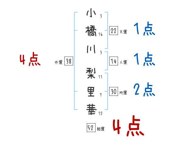 外運![]() | 小橋川梨里華さんの外運は38画の4つ星!温厚な性格で技術的な才能を発揮する。職人的な仕事に向いている。 生活面を象徴する運勢です。外部から受ける影響力を表し、結婚運、家庭運や職場、環境への順応性を表します。 |