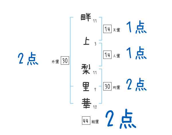 外運![]() | 畔上梨里華さんの外運は30画の2つ星!浮き沈みの激しさに注意しましょう。 生活面を象徴する運勢です。外部から受ける影響力を表し、結婚運、家庭運や職場、環境への順応性を表します。 |