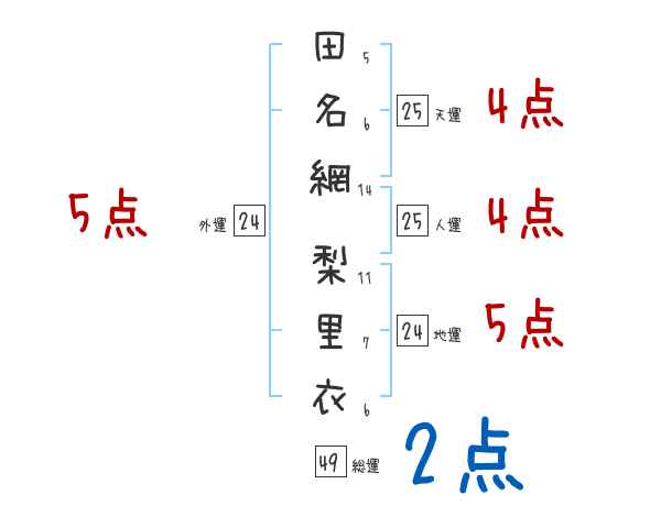 外運![]() | 田名網梨里衣さんの外運は24画の5つ星!家庭運が良く順調な人生。金運にも恵まれる。 生活面を象徴する運勢です。外部から受ける影響力を表し、結婚運、家庭運や職場、環境への順応性を表します。 |