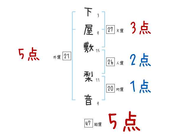 天運![]() | 下屋敷梨音さんの天運は27画の3つ星!頭脳明晰だが強情で摩擦が多い傾向。孤立に注意。 家系が持つ宿命的な運勢を表します。祖先から受け継いだ苗字ですので自分の力が及びません。家柄を象徴します。 |