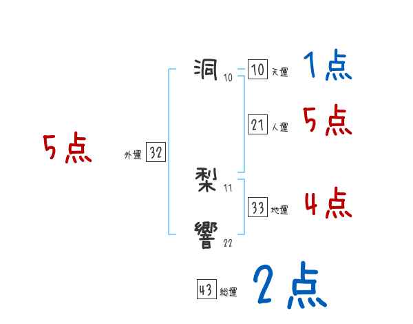 人運![]() | 洞梨響さんの人運は21画の5つ星!統率力がある。独立し成功する。名誉を手に入れる。 性格や才能などを表す2番目に重要な運勢です。人間関係や協調性、社会的な成功に影響します。主に20歳から50歳ぐらいまでの中年期の運勢を表します。 |