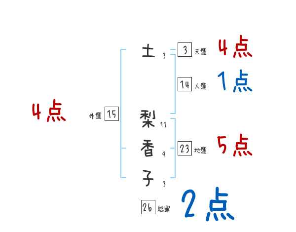 天運![]() | 土梨香子さんの天運は3画の4つ星!活動的で才能に恵まれ、多くの信頼を得る。希望に満ち成長する。 家系が持つ宿命的な運勢を表します。祖先から受け継いだ苗字ですので自分の力が及びません。家柄を象徴します。 |