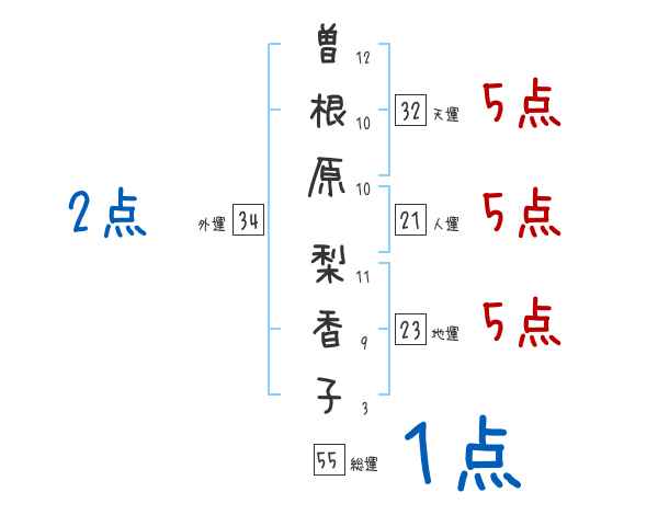 天運![]() | 曽根原梨香子さんの天運は32画の5つ星!柔軟性があり成功する。チャンスが多く金運が良い。 家系が持つ宿命的な運勢を表します。祖先から受け継いだ苗字ですので自分の力が及びません。家柄を象徴します。 |