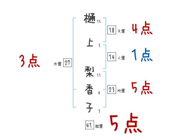 外運![]() | 樋上梨香子さんの外運は27画の3つ星!頭脳明晰だが強情で摩擦が多い傾向。孤立に注意。 生活面を象徴する運勢です。外部から受ける影響力を表し、結婚運、家庭運や職場、環境への順応性を表します。 |