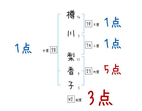 総運![]() | 樽川梨香子さんの総運は42画の3つ星!病気に注意。多芸であるが消極的でおとなしい。 あなたの人生を表す1番重要な運勢です。生涯を通じて影響する総合運となり、主に50歳以降の晩年期に影響を及ぼします。 |