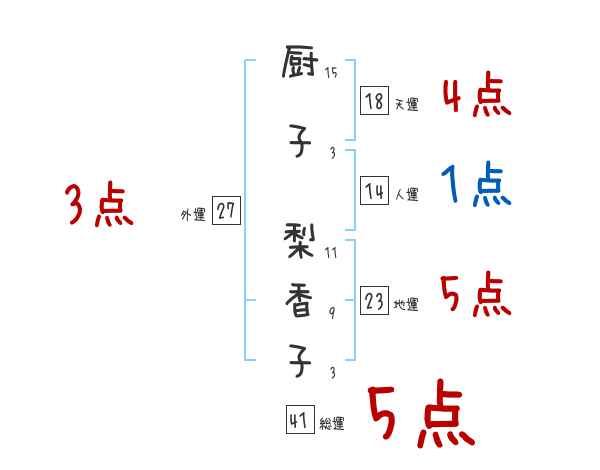 外運![]() | 厨子梨香子さんの外運は27画の3つ星!頭脳明晰だが強情で摩擦が多い傾向。孤立に注意。 生活面を象徴する運勢です。外部から受ける影響力を表し、結婚運、家庭運や職場、環境への順応性を表します。 |