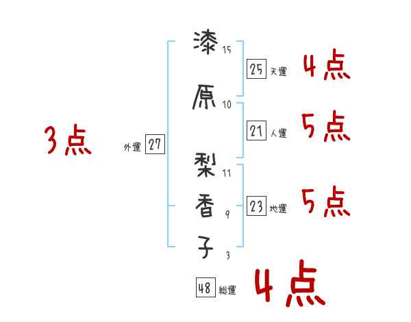 外運![]() | 漆原梨香子さんの外運は27画の3つ星!頭脳明晰だが強情で摩擦が多い傾向。孤立に注意。 生活面を象徴する運勢です。外部から受ける影響力を表し、結婚運、家庭運や職場、環境への順応性を表します。 |