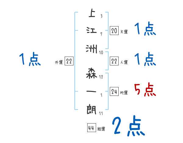 外運![]() | 上江洲森一朗さんの外運は22画の1つ星!努力することが苦手ないっぽう手先が器用。芸術性にも優れる。 生活面を象徴する運勢です。外部から受ける影響力を表し、結婚運、家庭運や職場、環境への順応性を表します。 |