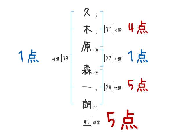 外運![]() | 久木原森一朗さんの外運は19画の1つ星!優れた才能を持ちますが、協調性が足りないことも。周りの人と協力する事を意識しましょう。 生活面を象徴する運勢です。外部から受ける影響力を表し、結婚運、家庭運や職場、環境への順応性を表します。 |